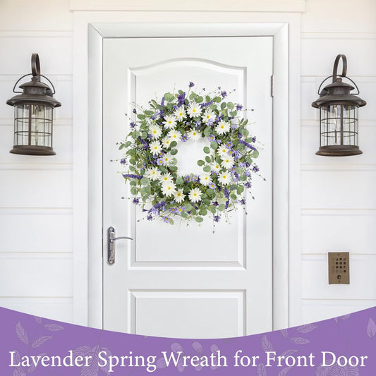 24 Inch Lavender Floral Spring Summer Wreaths for Front Door with Lights Timer, Handmade Floral Wreath with Daisy Eucalyptus on Grapevine Wreath Base, Perfect for Farmhouse Outdoor Wall Home Decor