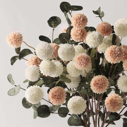 7Pcs Beige White Faux Kiku Flower 25 Heads+18 Eucalyptus, Long Stem Pom Pom Fake Mums Artificial Flowers for Vase Silk Chrysanthemum for Centerpiece Bouquet Floral Arrangement Tan Nude Neutral Cream