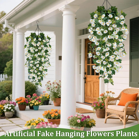 2PCS Artificial Vine, Ivy Vine with Faux Silk Morning Glory, UV Resistant Fake Hanging Flowers Plants, Realistic Outdoor Outside Decor for Porch Patio Spring Summer Home Decoration (White)